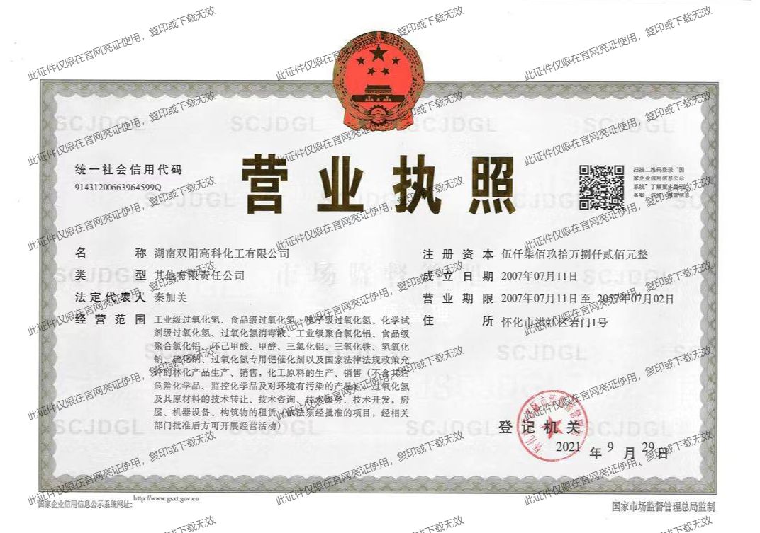 雙陽(yáng)高科主要產(chǎn)品有工業(yè)級(jí)雙氧水、食品級(jí)雙氧水、電子級(jí)雙氧水、化學(xué)試劑級(jí)雙氧水、雙氧水消毒液、工業(yè)級(jí)聚合氯化鋁、食品級(jí)聚合氯化鋁、純度為99.5%的環(huán)己甲酸等產(chǎn)品,年產(chǎn)值過2億元,目前,公司產(chǎn)品內(nèi)銷全國(guó)各地,外銷東南亞等國(guó)家和地區(qū),擁有廣闊的國(guó)內(nèi)與國(guó)際市場(chǎng)。